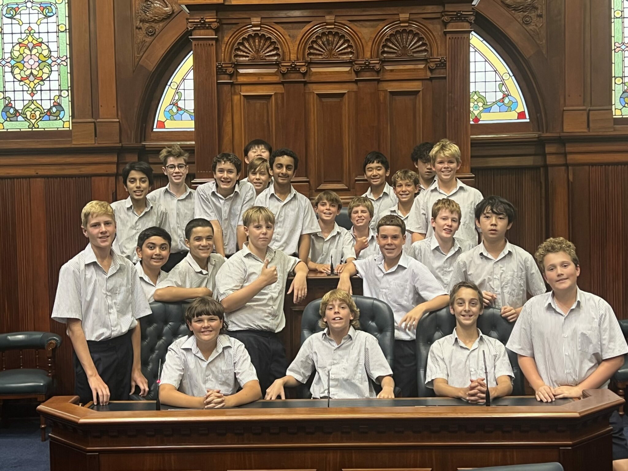 Guided by the Parliament’s education team, the boys explored the chambers, engaged in role-play activities, and gained a deeper understanding of how laws are made. In Mr Wyllie’s class (pictured), Archie Anning took on the prestigious role of Speaker of the Lower House, describing it as “a cool view of the chamber from up there.”